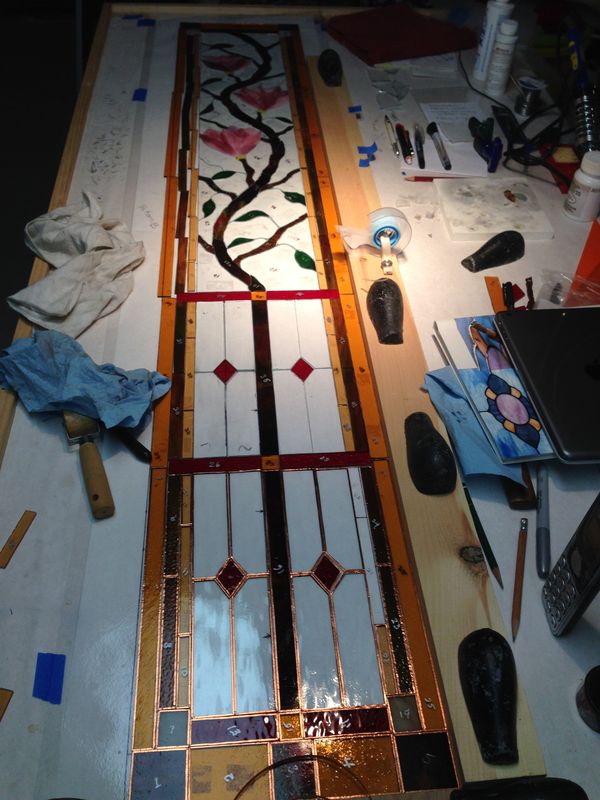 The front entrance faces southeast toward Black Rock's beautiful harbor and saltwater environment of Long Island Sound. This required the incorporating a design parameter to protect the panels from corrosive salt air and New England''s frequent Nor'easter storms. Full-length thermopane windows were installed as thermal barriers providing the desired protection for the glass panels. The following pictures provide a glimpse into the design and creation of the panels, along with a photo of the final results once installed.