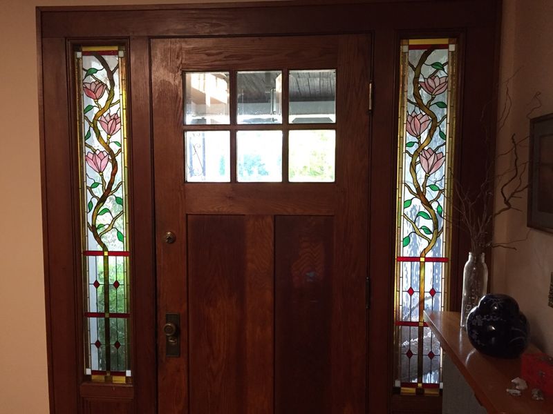 When I purchased my 1921 vintage home in the Black Rock section of Bridgeport, CT, the front entrance had the two original sidelights - simple 6-mullion white wooden frames with bland frosted glass panes. I felt the entrance needed a more interesting period look and I wanted to meld the precise geometric lines of Prairie style with the flowing organic style of Arts and Crafts style.